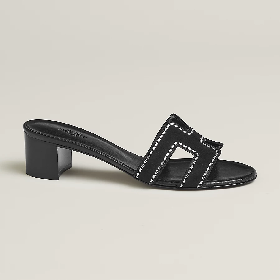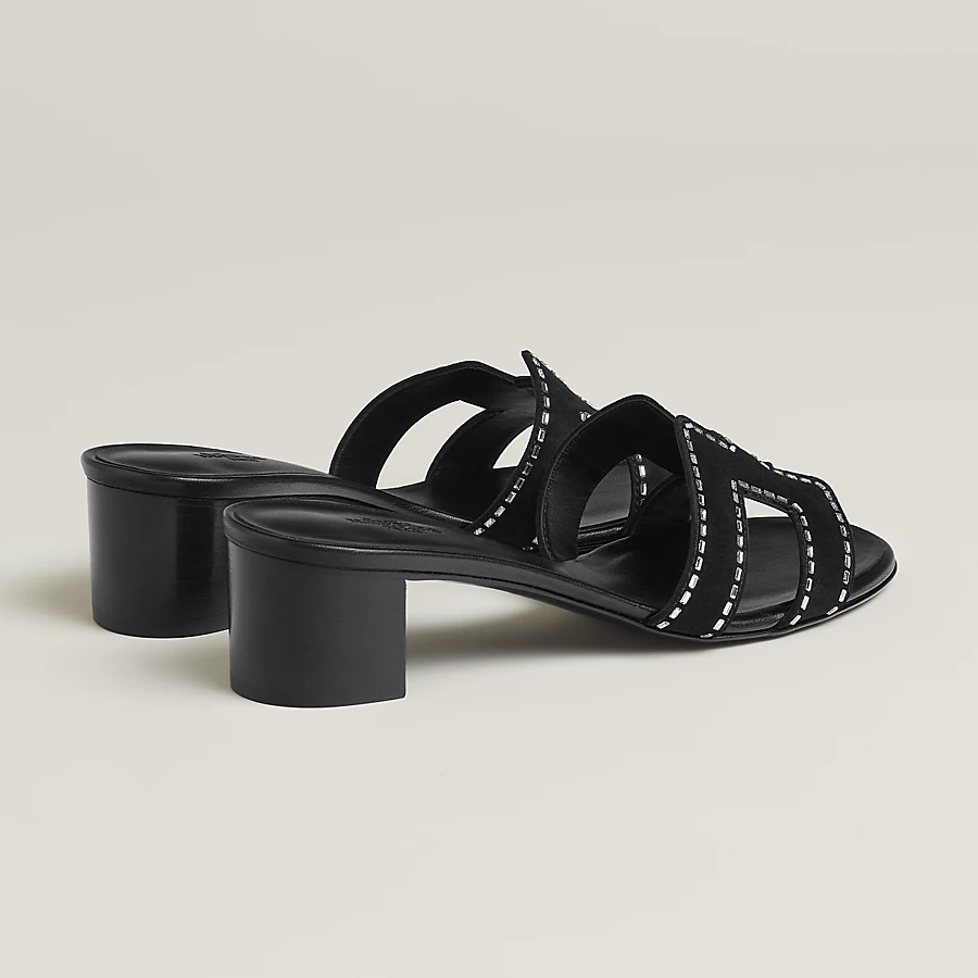 High heel sandal in suede goatskin with iconic “H” cut-out and rhinestone details.