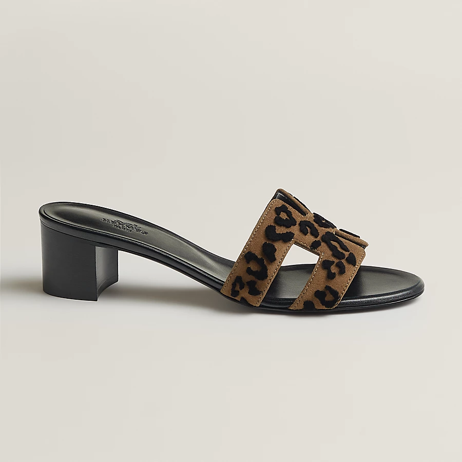High heel sandal in tufted suede goatskin in printed leopard with iconic “H” cut-out.