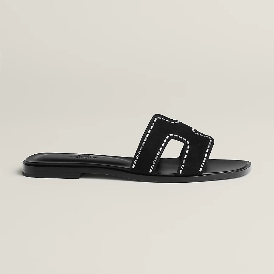 Sandal in calfskin with iconic “H” cut-out and rhinestone details.