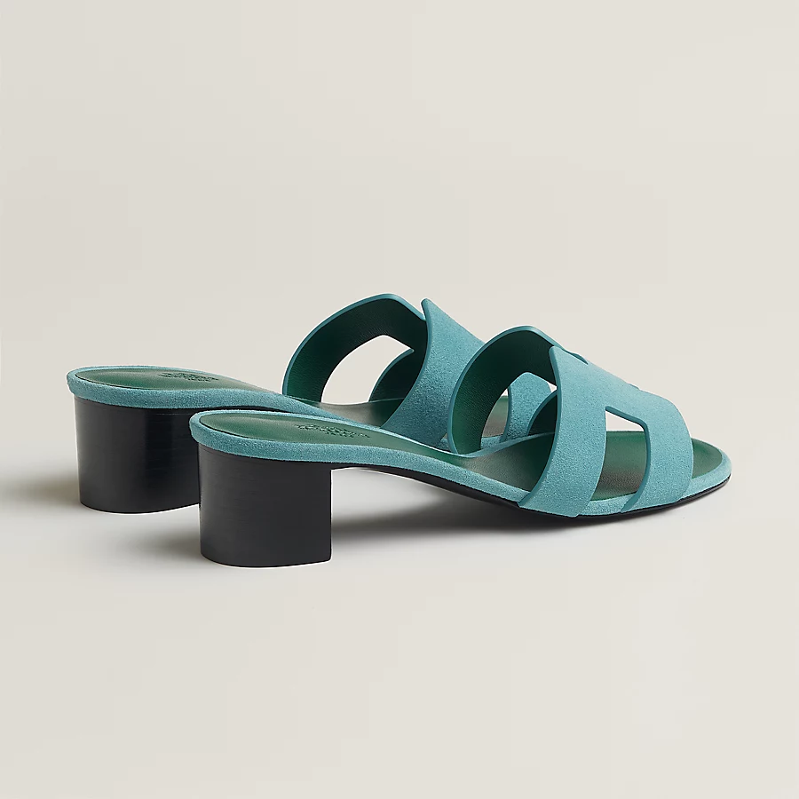 High heel sandal in suede goatskin with iconic “H” cut-out detail and straight-cut edges.