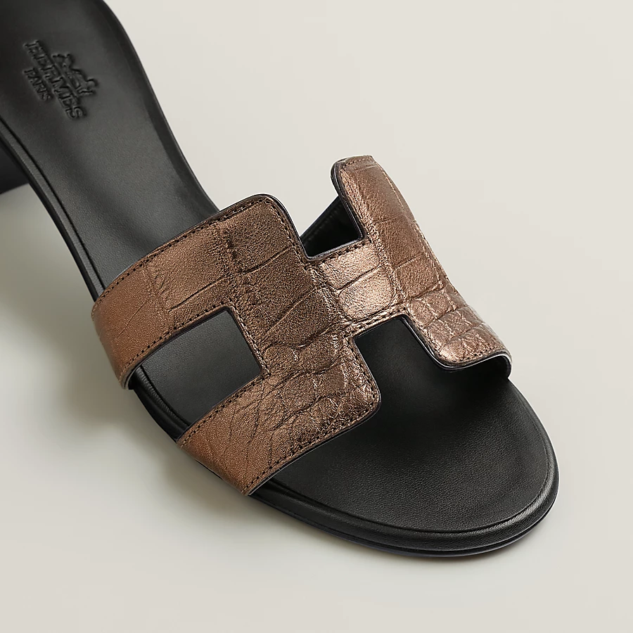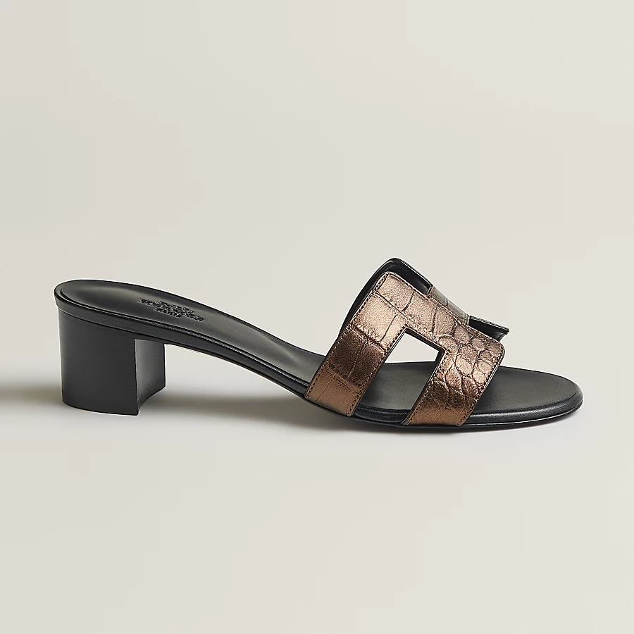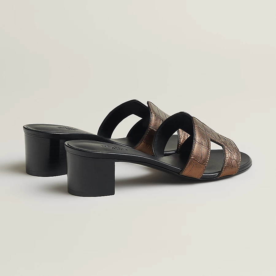 High heel sandal in Mississippiensis alligator with metallic finish and iconic “H” cut-out detail.