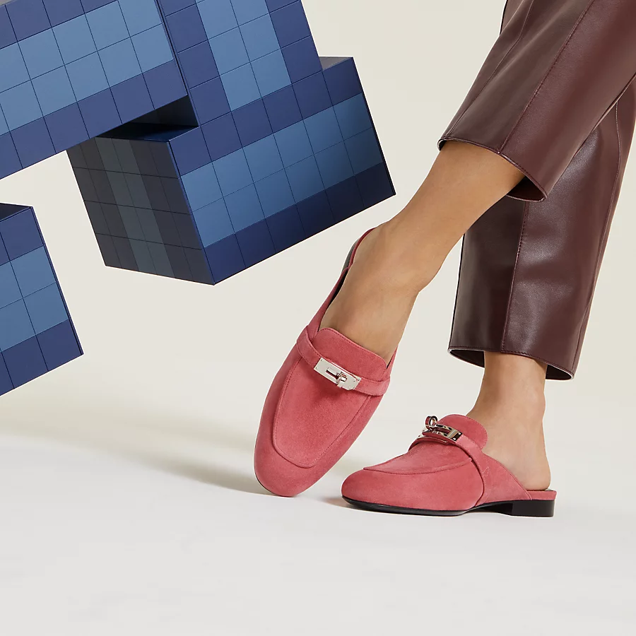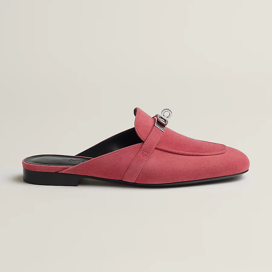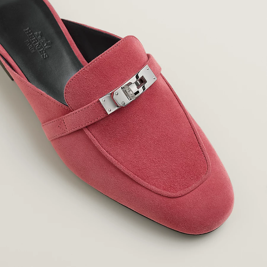 Mule in suede goatskin with iconic palladium-plated Kelly buckle.