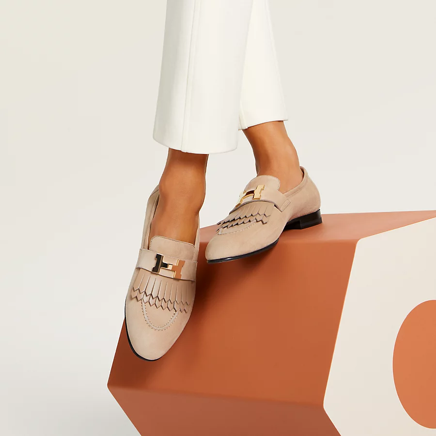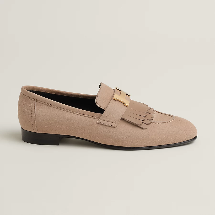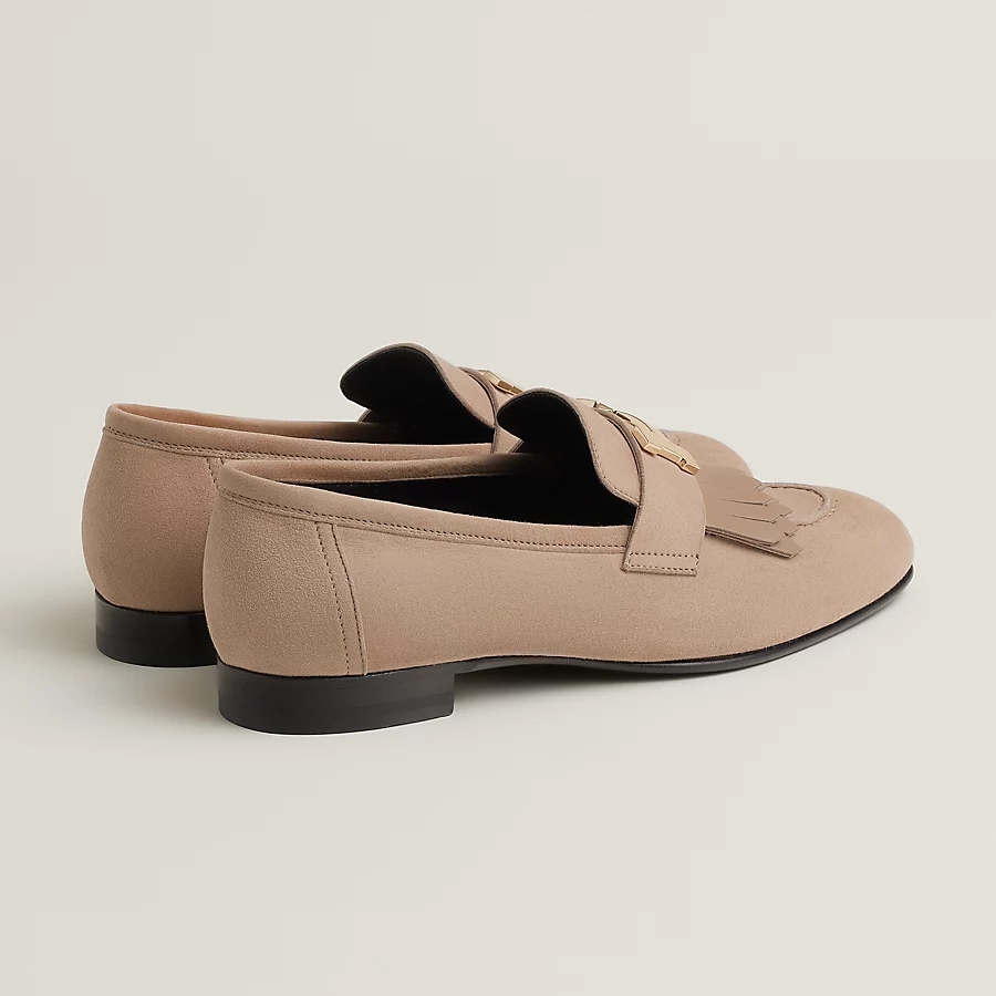 Loafer in suede goatskin and calfskin with fringe detail and signature Paris buckle.