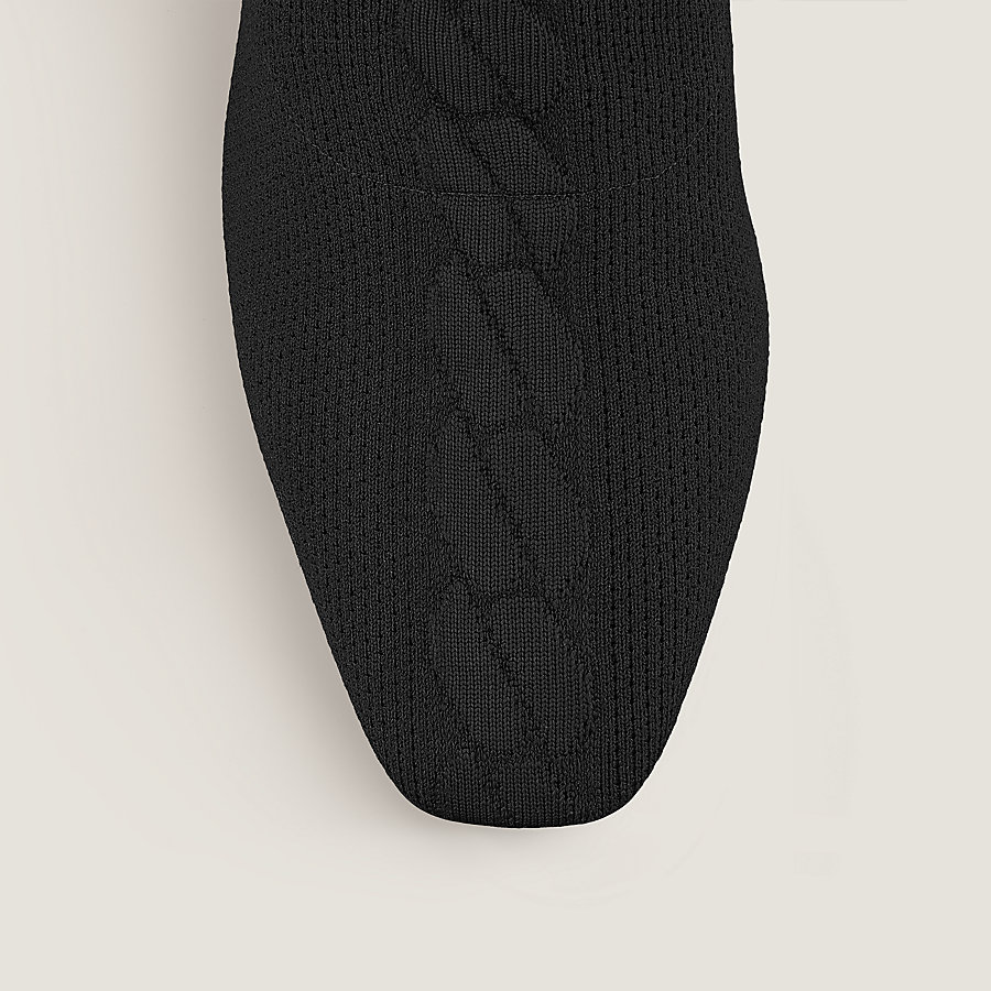 Ankle boot in knit with “Clic! C’est Noue” motif, “Ex-Libris” motif in calfskin and heel with horseshoe detail.