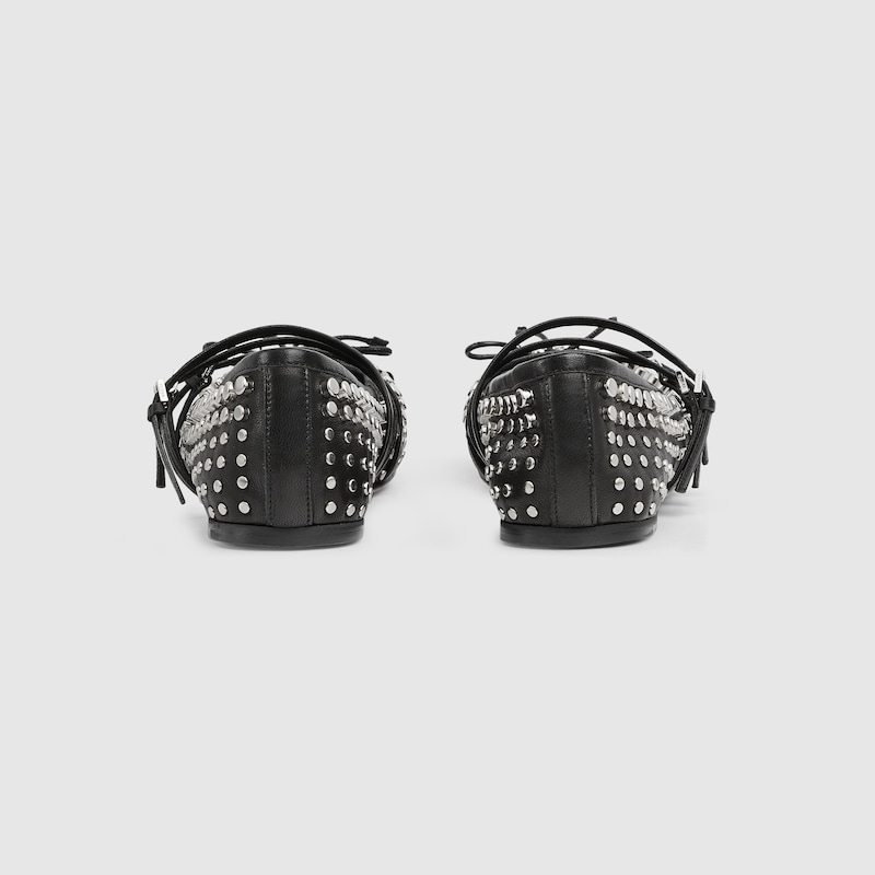 This Horsebit ballet flat pays homage to the original ballet shoe silhouette defined by a squared tucked toe cap and the delicate bow detail. This style is crafted in black leather and defined by an allover studs detail. The “sacchetto” construction ensures a high level of comfort, thanks also to the soft padded insole.