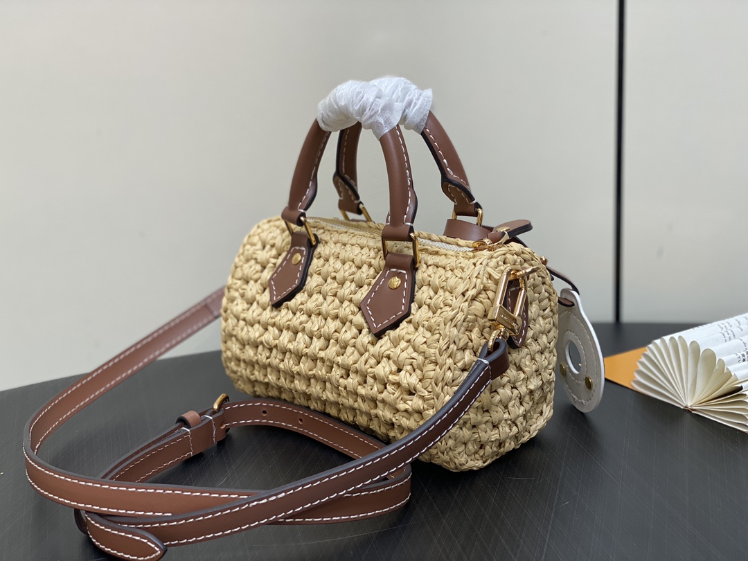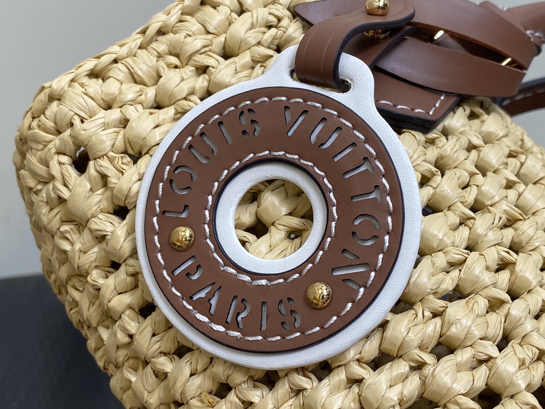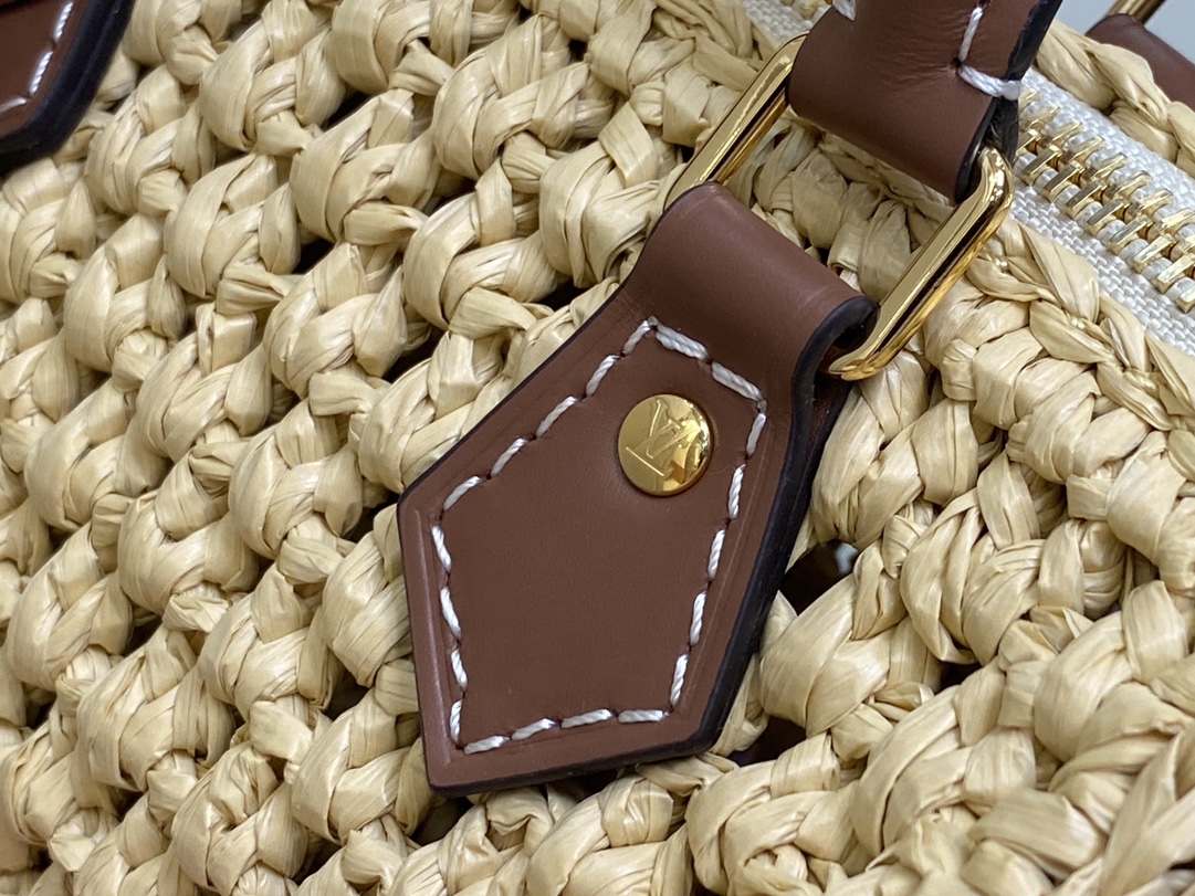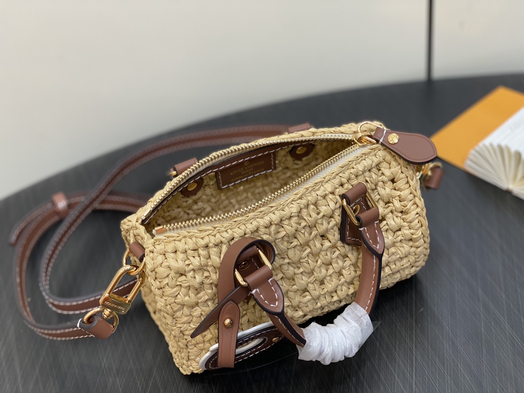 This exclusive interpretation of the Nano Speedy bag is crafted from pure natural raffia, which is crocheted by hand by Madagascan artisans. This exceptional design is complemented by leather trim, including a removable Louis Vuitton signature patch. Two top handles and a removable, adjustable shoulder strap complete this refined piece.
