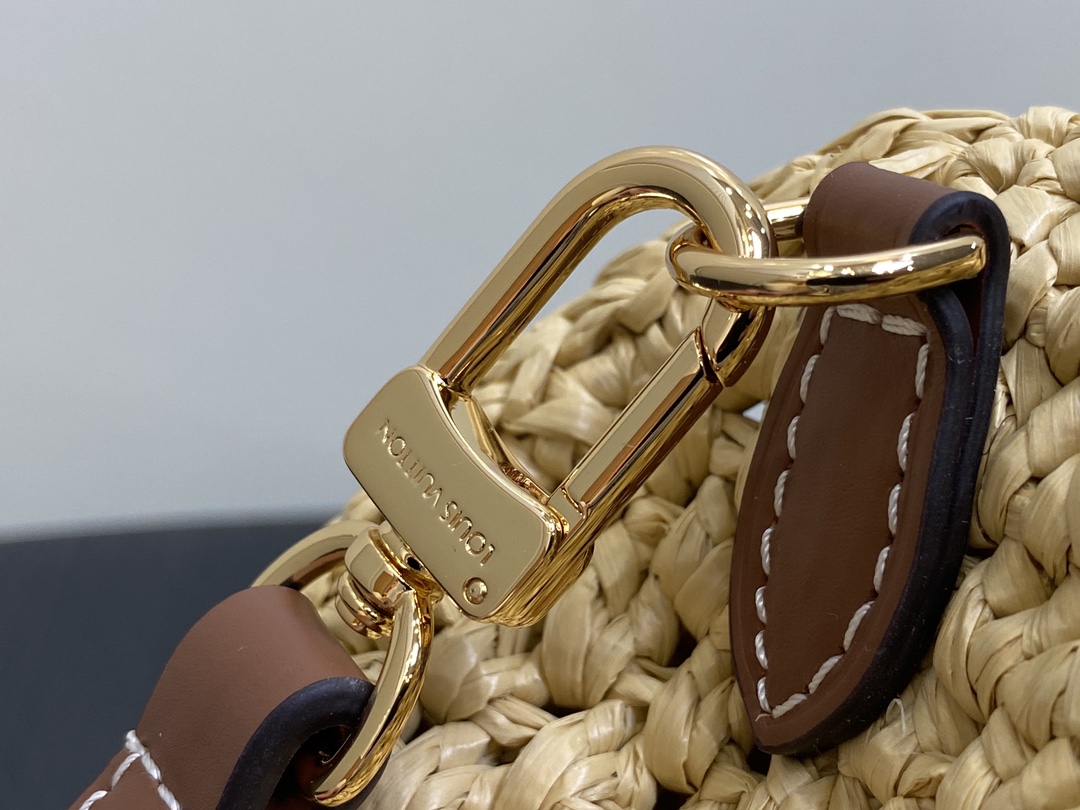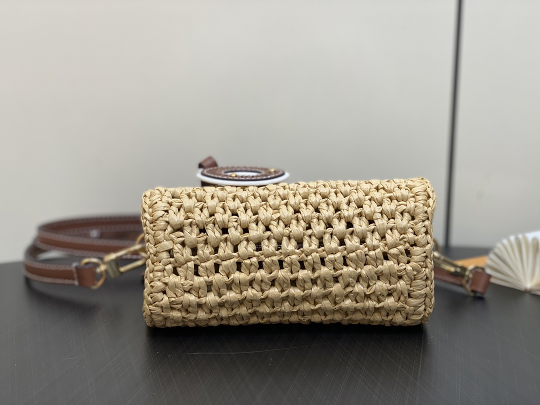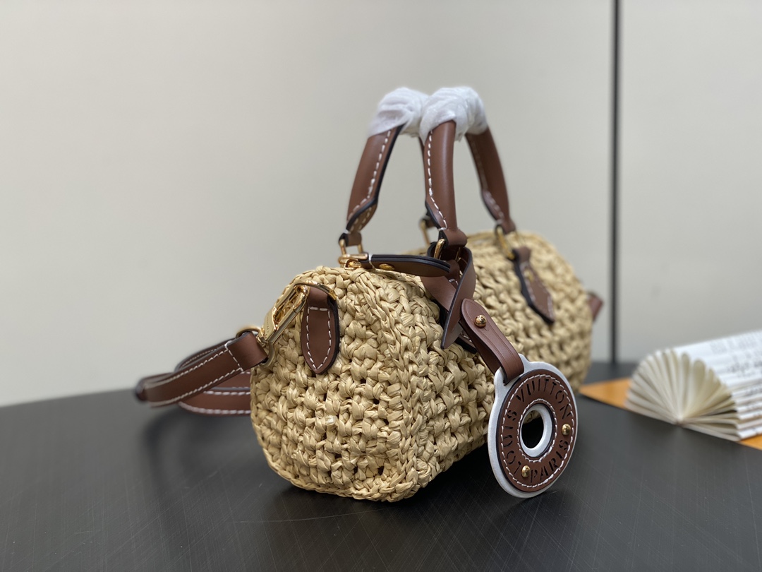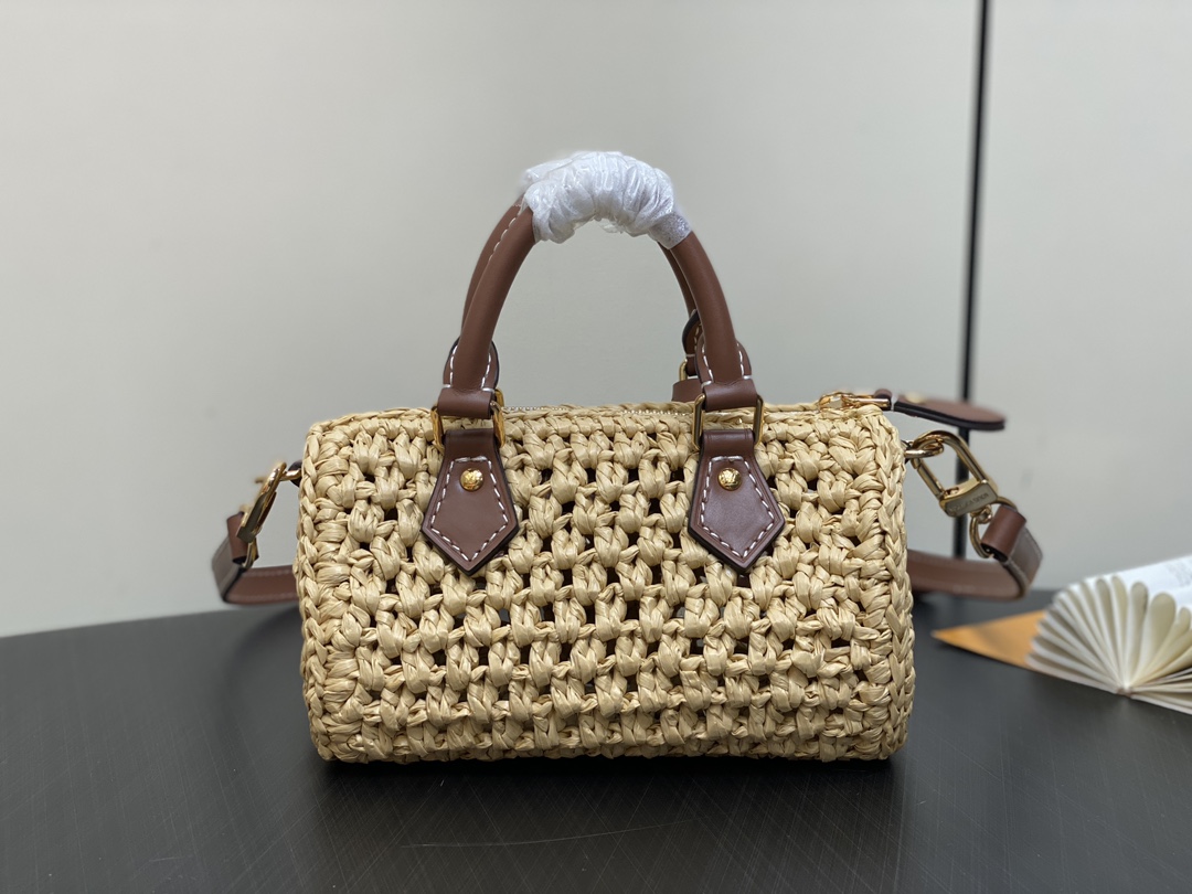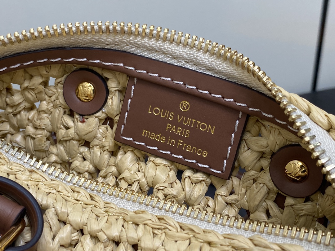 This exclusive interpretation of the Nano Speedy bag is crafted from pure natural raffia, which is crocheted by hand by Madagascan artisans. This exceptional design is complemented by leather trim, including a removable Louis Vuitton signature patch. Two top handles and a removable, adjustable shoulder strap complete this refined piece.